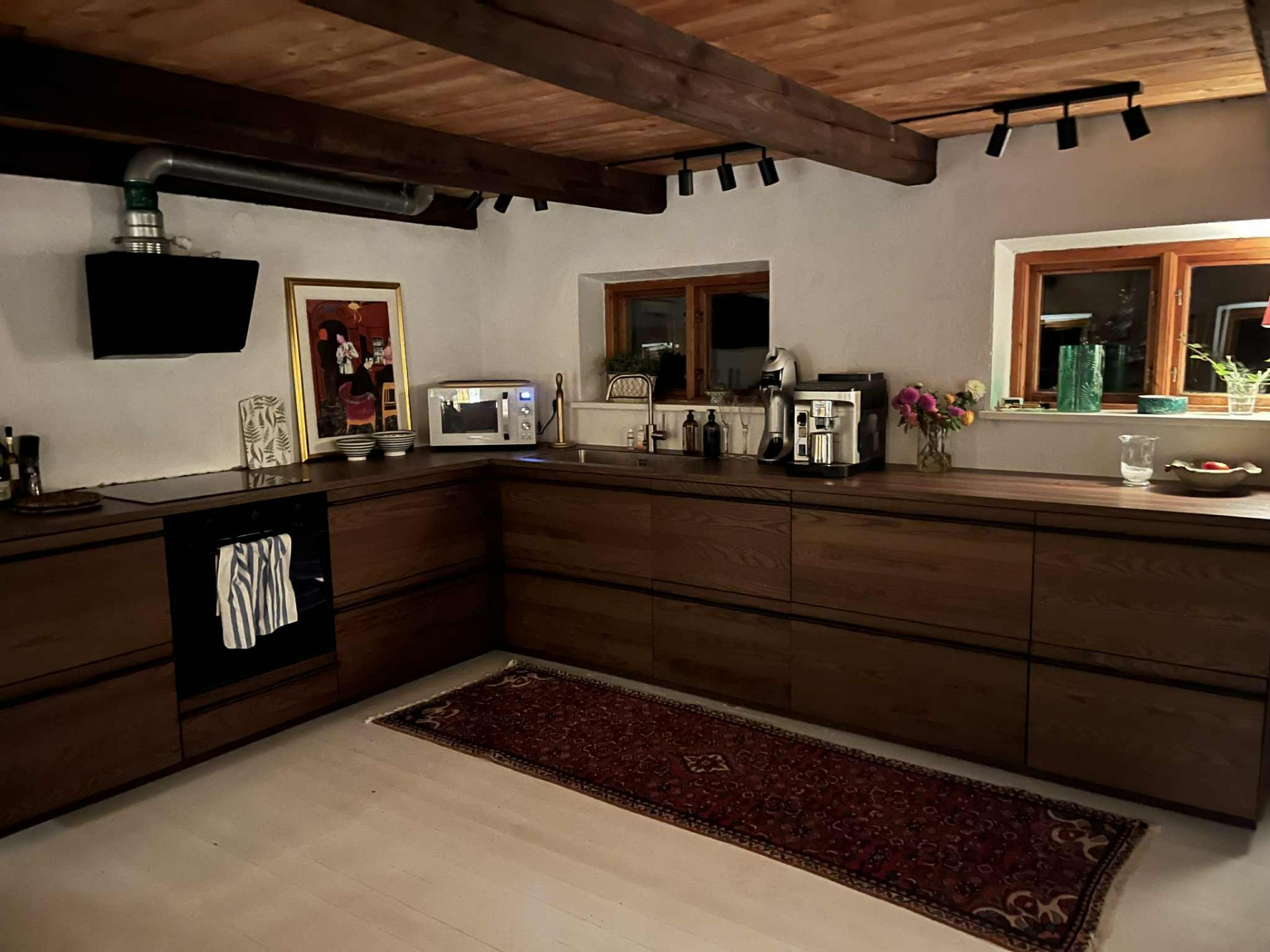 Ett nytt kök i valnöt som harmonierar med de mörka träbjälkarna och skapar en varm, nedtonad och inbjudande känsla i den gamla skånelängan.